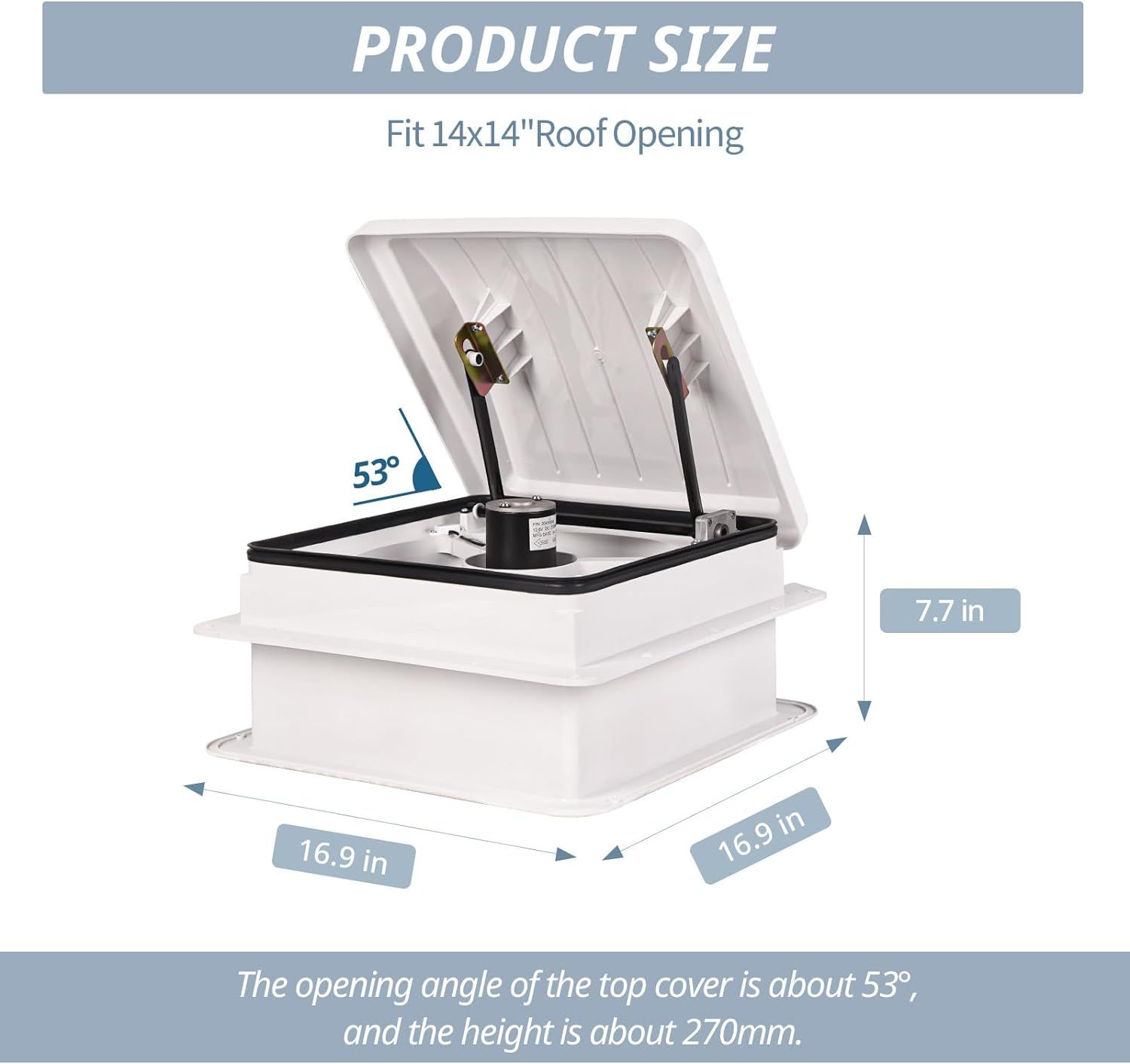 [�������� ���� ��������������]The rv vent fan fits all 14" x 14" roof openings.The fan is designed for a minimum roof thickness of 1 inches to a maximum of 6 1/2 inches.If your roof thickness is less than 1 inches, build additional thickness at the ceiling opening using wood or other suitable material.
