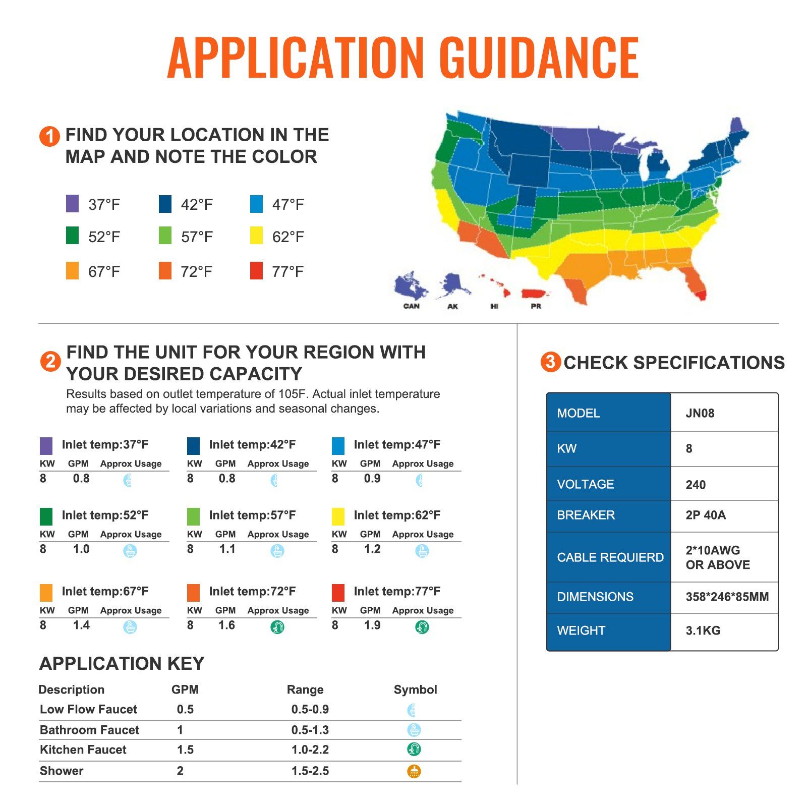 5.Know about Installation: Wall-mount design maximizes your living or working space. Our compact electric water heater comes with NPT 1/2'' water inlet and outlet. Please note that 1 x 40A circuit breakers and 1 x 10AWG power cables are required for installation, and we recommend seeking professional assistance.