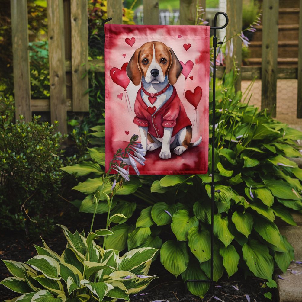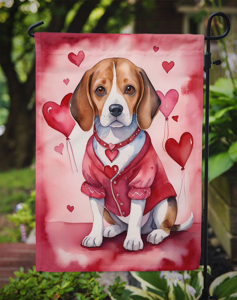 Garden Flag featuring breed specific Beagle artwork. Celebrate Valentine's Day with this Valentine's Day Garden Flag. Enhance the beauty of your garden, patio, or yard with Caroline's Treasures Decorative Garden Flag, proudly made in the USA. Crafted from two pieces of thick, double-sided polyester fabric, this 2-ply garden flag is designed to withstand various weather conditions, making it water-resistant and weatherproof. Featuring correctly readable words on both sides, this garden flag offers a delightful visual experience from any angle. With its heavier weight, it stands out among other garden flags, ensuring stability and durability even in wind, rain, and snow. Measuring approximately 11 1/4 inches by 15 1/2 inches, this flag allows you to personalize your outdoor decor. It comes with a 1 1/2-inch sleeve sewn in, allowing easy attachment to any standard garden flag stand or garden size porch hanger (sold separately). Make a statement in your outdoor space with Caroline's Treasures Decorative Garden Flag, a vibrant and high-quality flag that adds color and personality to your surroundings. Proudly made in the USA, it's a symbol of quality craftsmanship and attention to detail.