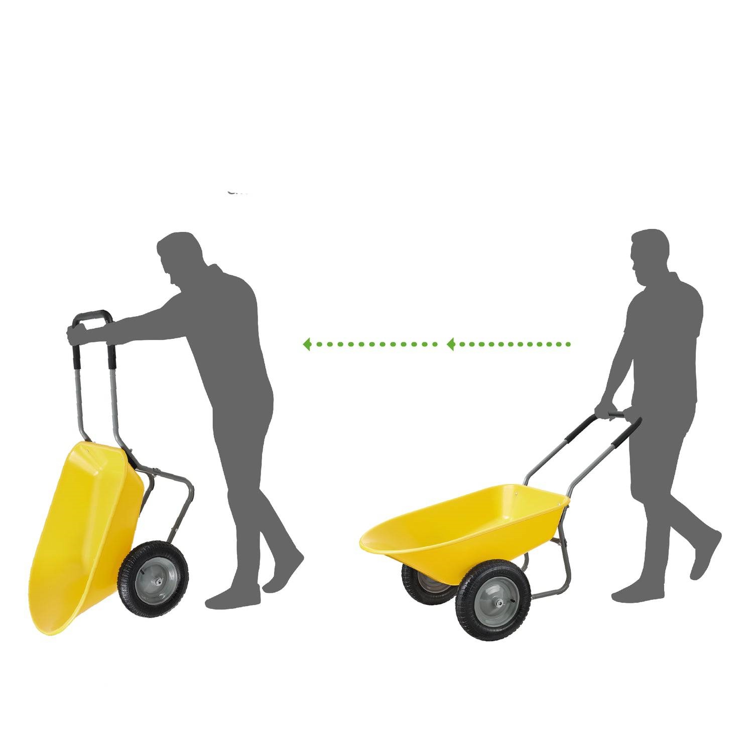 Grab your wheelbarrow and let's get to work! This Heavy Duty Dual Wheel Multipurpose Rust Proof Wheelbarrow - Yellow is crafted with a plastic bin and powder-coated steel frame that prevents breakdown and wear for long-lasting use. This deep wheelbarrow holds up to 5 cubic feet of soil, bricks, mulch, gravel, and more, so you can conveniently carry out landscaping and other home improvement projects. Comes built with inflatable 13-inch rubber wheels, for a sturdy build that makes it easy to steer the cart on various terrains. Has a thick padded handlebar that doubles as a stand for idle use and makes moving the wheelbarrow easy and comfortable.