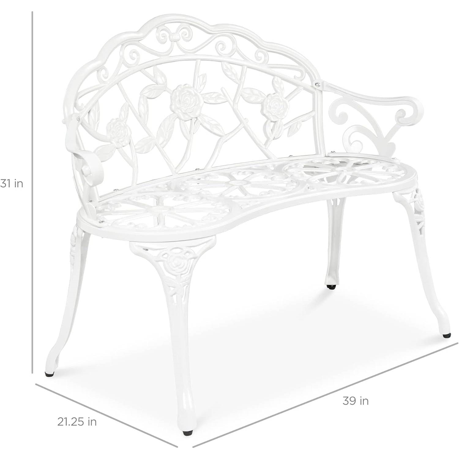 Lightweight and durable construction makes this Outdoor Patio 39-inch Garden Bench with Backrest in White Metal Finish an easy addition to your porch, patio, deck, or garden nook. Crafted with an all-steel frame and a rustic, weather-resistant finish to accent your porch or patio for years to come. 39-inch seat comfortably holds up to 3 guests with a weight capacity of 300 pounds. Beautifully detailed with unique floral accents across the back, seat, and even the legs. Cleverly designed to be lightweight with an open seat and back to promote airflow and allow easy cleanup while still providing support; OVERALL DIMENSIONS: 39"(L) x 21.25"(W) x 31"(H); Weight Capacity: 300 lbs.