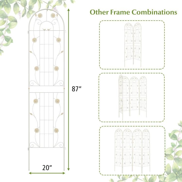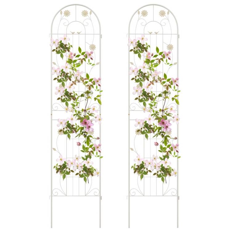 This 2 Pack - 7-ft Galvanized Steel Garden Trellis in White Metal Outdoor Finish is constructed of galvanized steel, ensuring unrivaled sturdiness and rust resistance to hold heavy plant for longer time. The trellis features 10.5", 11" long legs, allowing for effortless insertion into the ground, providing a stable foundation. With impressive heights of 71", the metal trellis offers an expansive area for your climbing plants and vines to reach new heights. By providing an abundance of vertical space, your plants can thrive as they eagerly stretch towards the sun's nourishing rays. Apart from being used as a plant support for climbing plants. The 2 pack trellis set can be combined with a garden fence, ensuring the protection and privacy of your cherished plants. Plus, you can connect 2 or more trellis in an A-shape frame for growing cucumbers or other climbing vegetables. Designed with enchanting birds, flowers and leaves, the tall garden fence will effortlessly add a touch of timeless elegance and retro charm to your garden, lawn, or yard. Moreover, you have the freedom to arrange more trellises to different layouts according to your unique requirements. Coming with complete components and a detailed instruction manual, the assembly process of the wire lattice grid panel is a breeze. Besides, the 2 pack fence trellises are designed with an effortlessly interlocked connector, allowing for quick setup.