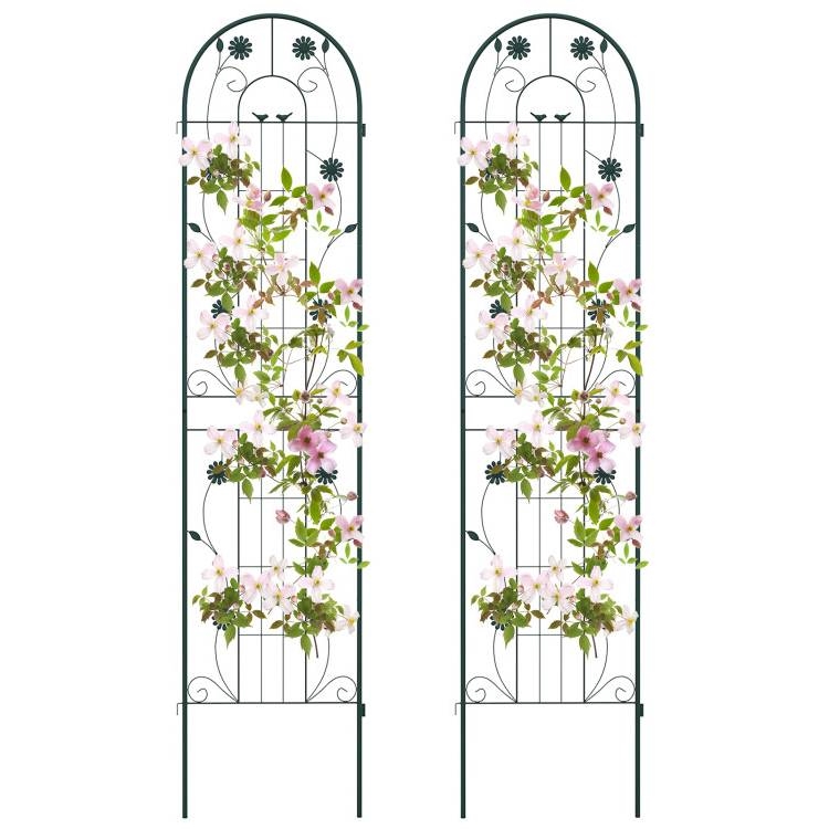 This 2 Pack - 7-ft Galvanized Steel Outdoor Garden Trellis in Green Metal Finish is constructed of galvanized steel, ensuring unrivaled sturdiness and rust resistance to hold heavy plant for longer time. The trellis features 10.5", 11" long legs, allowing for effortless insertion into the ground, providing a stable foundation. With impressive heights of 71", the metal trellis offers an expansive area for your climbing plants and vines to reach new heights. By providing an abundance of vertical space, your plants can thrive as they eagerly stretch towards the sun's nourishing rays. Apart from being used as a plant support for climbing plants. The 2 pack trellis set can be combined with a garden fence, ensuring the protection and privacy of your cherished plants. Plus, you can connect 2 or more trellis in an A-shape frame for growing cucumbers or other climbing vegetables. Designed with enchanting birds, flowers and leaves, the tall garden fence will effortlessly add a touch of timeless elegance and retro charm to your garden, lawn, or yard. Moreover, you have the freedom to arrange more trellises to different layouts according to your unique requirements. Coming with complete components and a detailed instruction manual, the assembly process of the wire lattice grid panel is a breeze. Besides, the 2 pack fence trellises are designed with an effortlessly interlocked connector, allowing for quick setup.