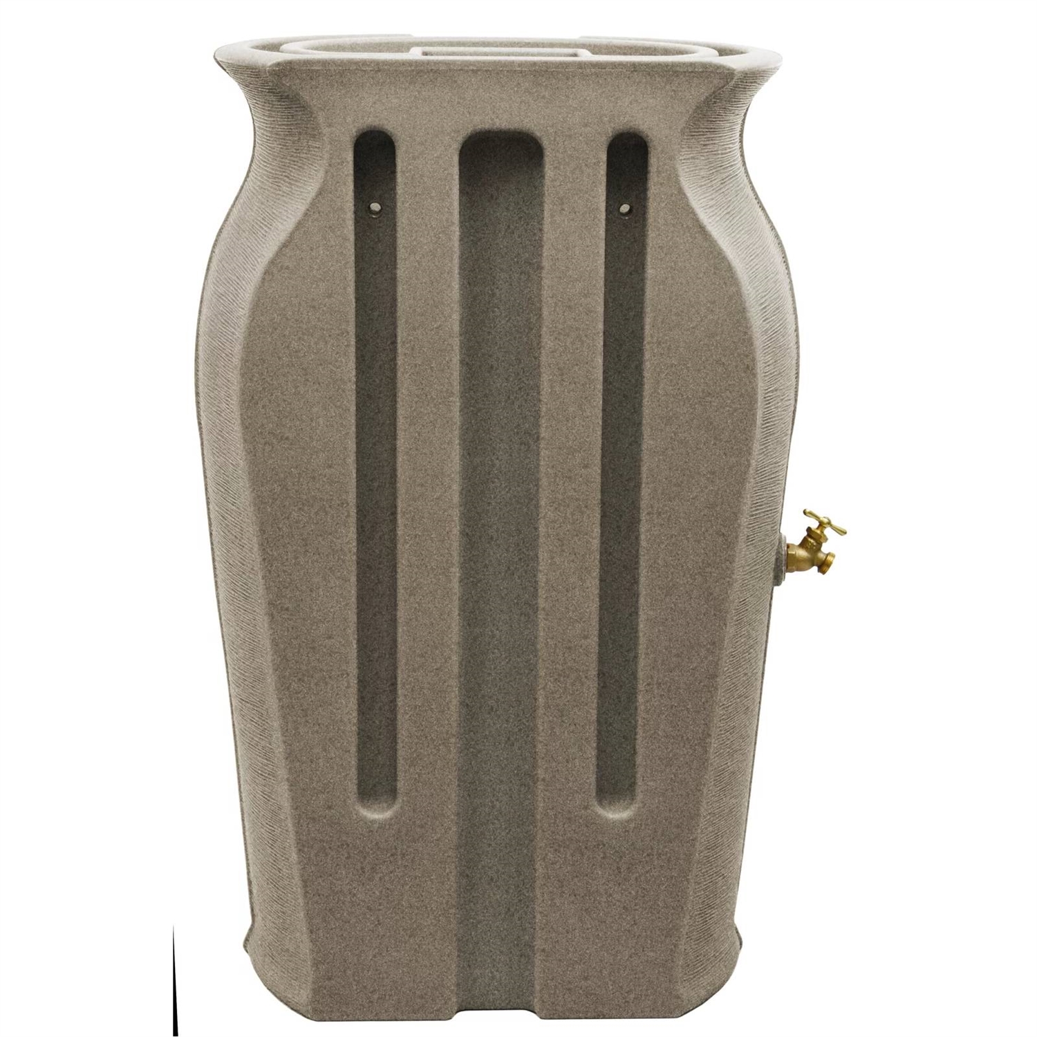 Catch water for your plants and help keep your foundation secure with this Grey SandStone 50-Gallon Plastic Urn Rain Barrel with Planter Top! Crafted in the USA from plastic in the style of classic pots with an amphora silhouette, this rain barrel includes two offset spigots that allow you to easily access all the rainwater this piece stores. And as a bonus, this piece showcases a planter and debris screen to help keep insects and other pests out of the water.